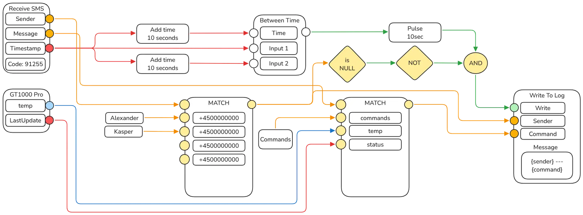 Debido a la forma en que los datos se envían a través de nuestro flujo, se puede llegar fácilmente a lo que se denomina "punto muerto". Un ejemplo de esto sería si usted como persona envía 2 SMSs al dispositivo con el mismo número de teléfono, entrará en punto muerto porque el "remitente" no se cambia - por lo tanto los datos no cambian.