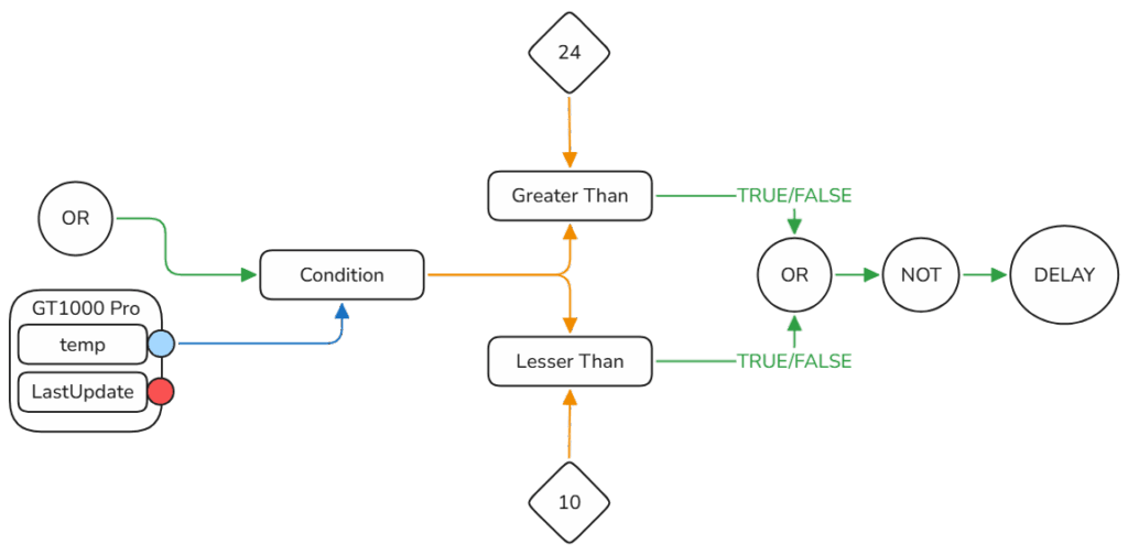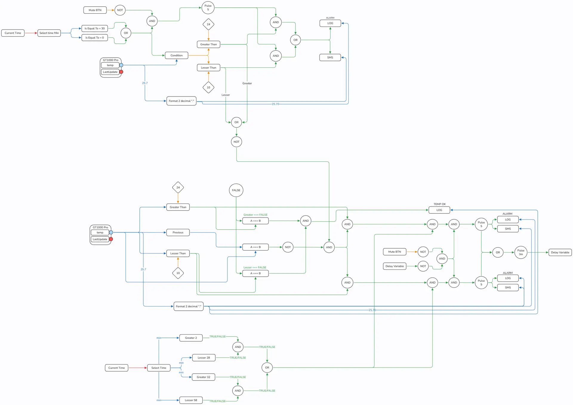 Así que necesitamos un sistema que compruebe si A es mayor o menor que B - si uno de ellos es correcto envía TRUE a su propia "compuerta AND" - entonces necesitamos una compuerta AND y pasamos a la parte de notificación.